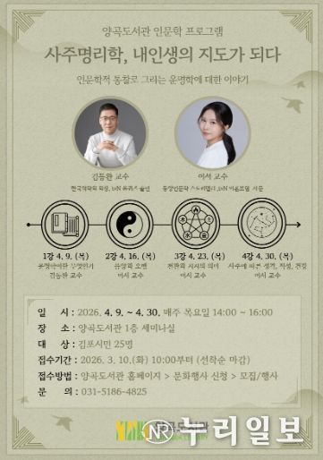 (누리일보) 김포시 양곡도서관은 오는 4월 9일부터 4월 30일까지 매주 목요일, 인문학 강좌 '사주명리학, 내 인생의 지도가 되다'를 운영한다.