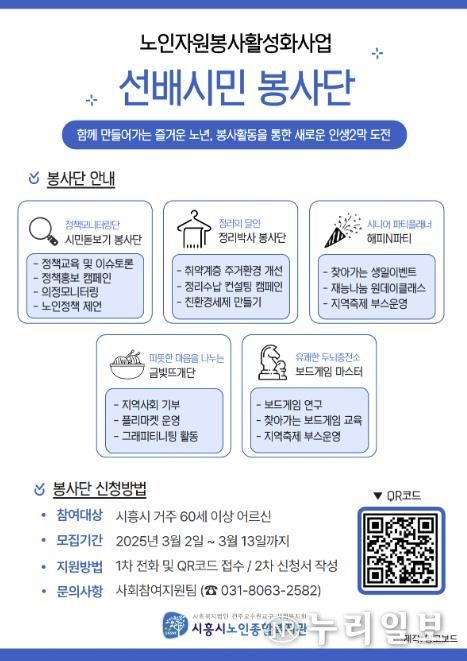 봉사단 인원은 총 10명을 선정할 계획으로, 모집 기간은 3월 13일까지다. 신청은 시흥시노인종합복지관 사회참여지원팀으로 전화하거나 홍보 포스터의 정보무늬(큐알코드)를 통해 하면 된다.