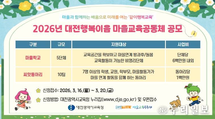 (누리일보) 대전시교육청은 마을과 학교가 협력하는 교육생태계 조성을 위해 ‘2026년 마을교육공동체 마을학교 및 씨앗동아리’를 공모한다고 밝혔다.
