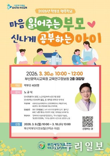 교육은 오는 30일 오전 10시, 부산진구 양정동 교육연구정보원에서 진행되며, 참가를 희망하는 학부모는 오는 9일 오전 10시부터 학부모지원포털을 통해 선착순으로 신청하면 된다. 자세한 사항은 학부모지원포털에서 확인할 수 있다.