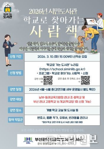 (누리일보) 부산광역시립시민도서관(관장 이은경)은 오는 4월부터 6월까지 부산 남부·동래교육지원청 관내 초·중학교 및 부산 관내 고등학교 등 16개교를 대상으로 ‘2026년 학교로 찾아가는 사람책’ 프로그램을 운영한다.