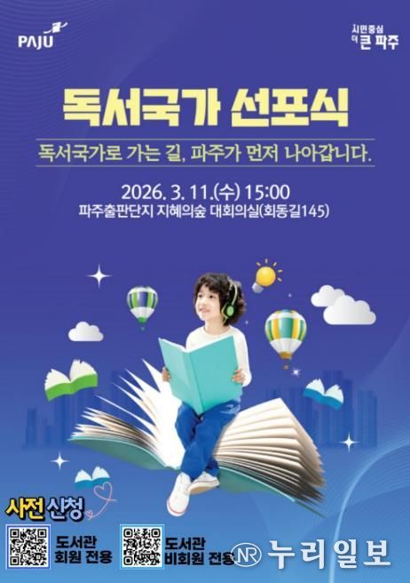 (누리일보) 파주시는 오는 11일 15시, 파주출판도시 지혜의숲 대회의실에서 ‘파주시 독서국가 선포식’을 개최하고 책 읽는 도시를 넘어 ‘독서국가’로 나아가기 위한 힘찬 출발을 알린다.