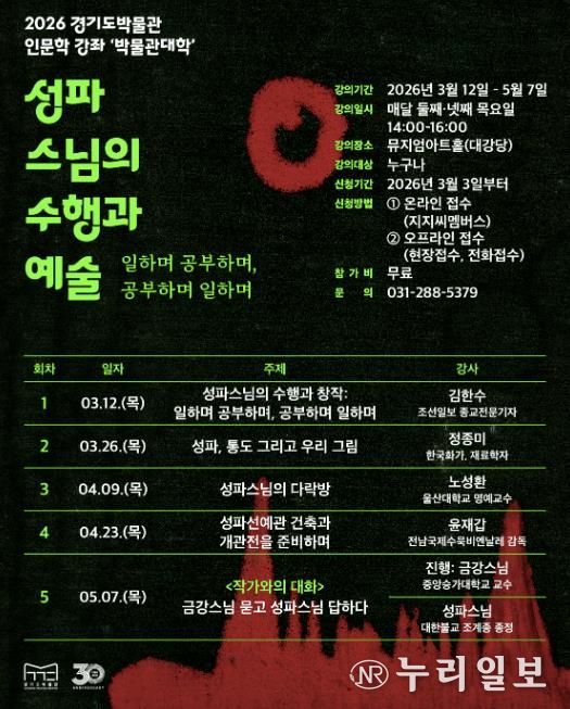 (누리일보) 경기도박물관은 오는 3월 12일부터 ‘2026 경기도박물관 박물관대학(인문학 강좌)’을 운영한다. 경기도박물관 박물관대학(인문학 강좌)은 매년 역사·문화와 관련한 시의성 있는 주제를 선정해 도민에게 제공하는 교육프로그램이다.