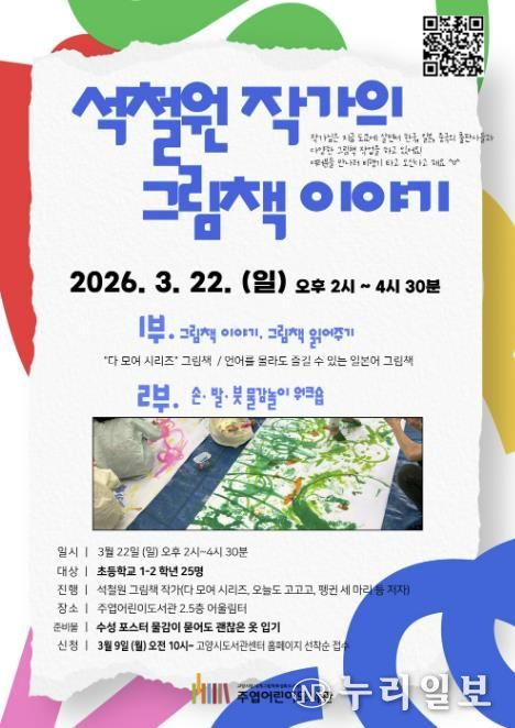 (누리일보) 고양특례시 주엽어린이도서관은 어린이들이 그림책 작가를 직접 만나 창작 이야기를 듣고 물감놀이에 참여할 수 있는 프로그램 ‘석철원 작가의 그림책 이야기’를 오는 3월 22일 운영한다.