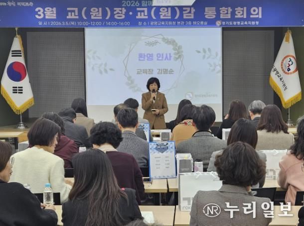(누리일보) 경기도광명교육지원청은 3월 5일, 광명교육지원청 3층 해오름실에서 2026 해오름 광명교육과 경기미래교육 구현을 위한 ‘2026년 3월 교(원)장, 교(원)감 통합회의’를 운영했다. 이번 통합회의는 학년 초 학교와 교육지원청, 도교육청 간의 협력을 강화하고, 학교 중심의 교육정책, 미래장학, 교육과정운영의 선순환 체제를 통해 학교 중심 행정 지원의 기틀을 마련하고자 진행됐다.