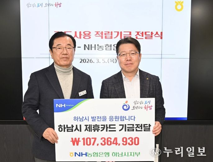 (누리일보) NH농협은행 하남시지부가 5일 제휴카드 사용 적립기금 107,364,930원 하남시에 전달했다고 밝혔다.