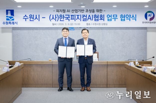 (누리일보) 수원특례시와 (사)한국피지컬에이아이(AI)협회는 6일 시청 상황실에서 업무협약을 체결하고, 피지컬 인공지능(AI) 산업 활성화를 위해 적극적으로 협력하기로 했다.