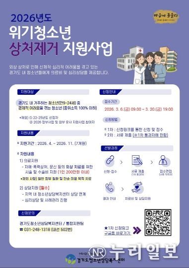 (누리일보) 경기도가 자해 상처, 폭력 피해 문신 등으로 신체적·심리적 어려움을 겪는 청소년을 돕기 위해 오는 20일까지 ‘위기청소년 상처제거 지원사업’의 상반기 신청자를 접수한다.