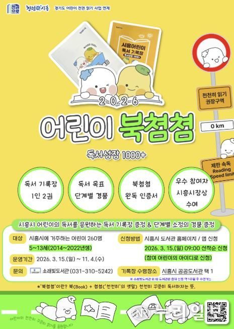 (누리일보) 시흥시 소래빛도서관은 오는 3월 15일부터 관내 5~13세 어린이 260명을 대상으로 독서 기록장을 배부하고, 우수 참여자 8명에게 시흥시장상을 수여하는 독서사업 ‘2026 어린이 북쳠쳠 독서성장 1000+’를 운영한다.