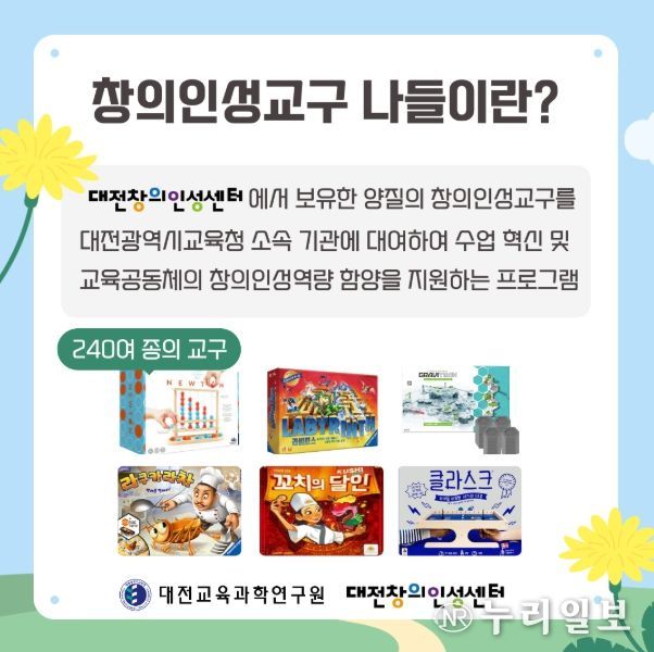 (누리일보) 대전시교육청 대전교육과학연구원 대전창의인성센터는 대전 관내 초·중·고등학교 및 대전시교육청 소속 기관을 대상으로 2026년 3월부터 2027년 1월까지 창의인성교구 대여 사업인 ‘창의인성교구 나들이’를 실시한다고 밝혔다.