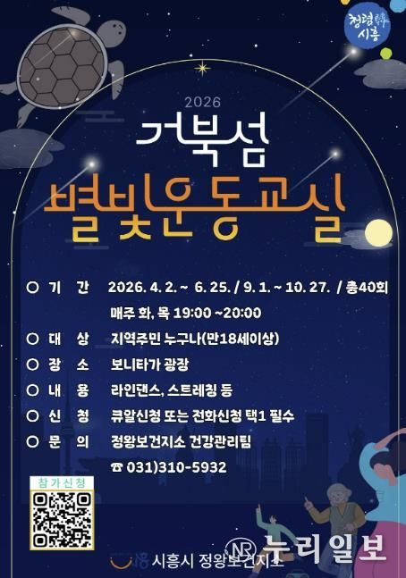 (누리일보) 시흥시는 지역주민의 신체활동 증진과 생활터 중심의 건강관리 지원을 위해 오는 4월 2일부터 거북섬동 보니타가 광장(MTV 3호광장)에서 ‘2026년 거북섬 별빛운동교실’을 운영한다.
