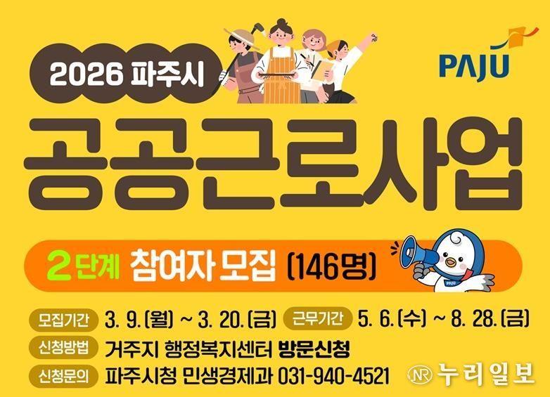 (누리일보) 파주시가 오는 20일까지 2026년 2단계 공공근로사업 참여자 146명을 모집한다.
