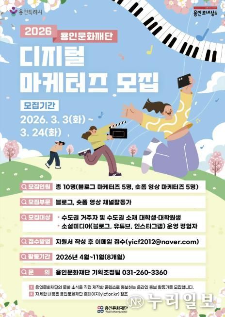 (누리일보) 용인문화재단은 오는 3월 24일까지 재단의 다양한 문화·예술사업을 시민의 시선으로 홍보하기 위한 ‘2026 용인문화재단 디지털 마케터즈’를 모집한다고 밝혔다.
