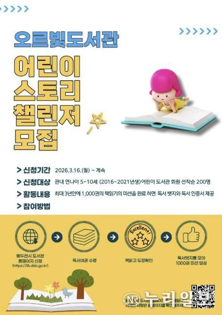 (누리일보) 동두천시 도서문화사업소는 3월 16일부터 관내 5-10세 어린이를 대상으로 ‘어린이 스토리 챌린저’ 참여자를 모집한다고 밝혔다. 이번 사업은 어린이의 자발적인 독서 습관 형성과 ‘책 읽는 동두천’ 분위기 조성 및 독서문화 확산을 위해 마련했다.