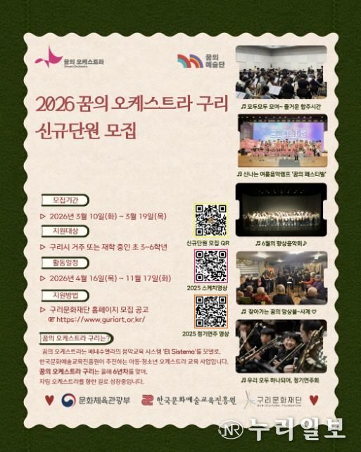 (누리일보) (재)구리문화재단이 2026년 ‘꿈의 오케스트라 구리’에 함께할 신규 단원과 교육 강사를 공개 모집한다. 이번 모집을 통해 초등학교 3학년부터 6학년까지의 아동 약 10명과 분야별 교육 강사 13명을 선발할 예정이다.