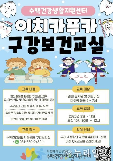 (누리일보) 구리시는 수택건강생활지원센터에서 미취학 아동의 올바른 구강 관리 습관 형성과 치아우식증 예방을 위해 관내 유치원과 어린이집 아동을 대상으로'이치카푸카 구강보건 교실'을 2026년 3월부터 11월 말까지 운영한다고 밝혔다.
