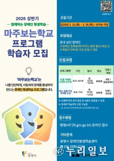 (누리일보) 광명시 평생학습원은 장애인 학습자의 자기 이해와 사회 참여 역량 강화를 위한 평생학습 프로그램 ‘마주보는학교’의 상반기 수강생을 오는 24일까지 모집한다.