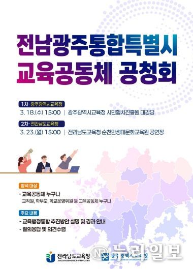 (누리일보) 전라남도교육청 ‘전남광주교육행정통합추진단’과 광주광역시교육청 ‘광주전남교육행정통합실무단’은 ‘전남광주통합특별시 교육공동체 공청회’를 3월 중 두 차례 개최한다.