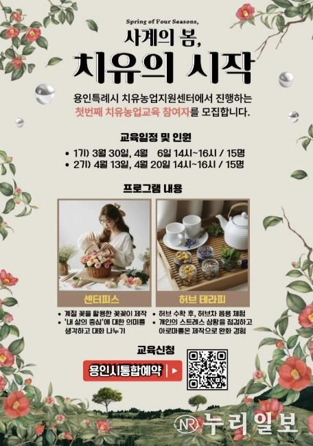 (누리일보) 용인시 농업기술센터는 치유농업지원센터에서 오는 3월 20일부터 4월 20일까지 치유농업 프로그램 ‘사계의 봄(Spring of Four Seasons), 치유의 시작’을 운영한다고 11일 밝혔다.