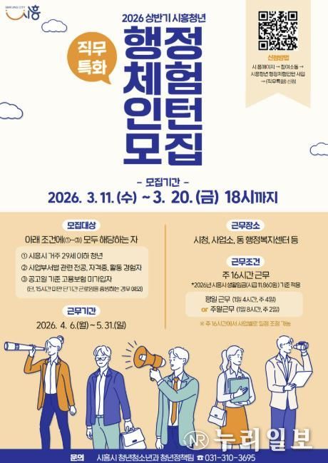 (누리일보) 시흥시는 지역 청년들의 실질적인 일 경험과 진로 탐색을 지원하기 위해 ‘2026년 (직무특화) 상반기 행정체험 인턴 사업’을 운영하고, 3월 11일부터 20일까지 참여 청년 10명을 모집한다.