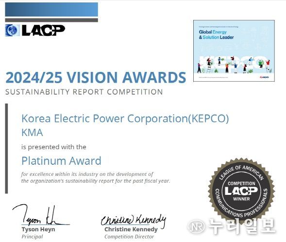 (누리일보) 한국전력의 지속가능경영보고서가 미국 커뮤니케이션 연맹 LACP(League of American Communications Professionals)가 주최하는 '2024/25 비전어워드(Vision Awards)'유틸리티 분야에서 2016년 이후 10년 만에 최고 등급인'대상(Platinum)'을 수상했다.
