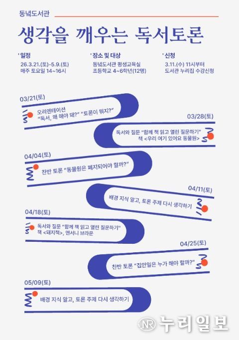 먼저 초등학교 4~6학년을 대상으로 21일부터 5월 9일까지 매주 토요일 ‘생각을 깨우는 독서토론’을 운영하며 책의 내용을 비판적으로 바라보고 능동적으로 읽는 힘을 기르는 독서토론 활동으로 진행된다.