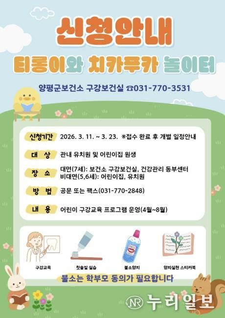 (누리일보) 양평군은 어린이집 및 유치원 아동을 대상으로 올바른 구강관리 습관 형성과 구강건강 증진을 위해 ‘티롱이와 치카푸카 놀이터’ 프로그램을 4월부터 8월까지 운영한다고 밝혔다.