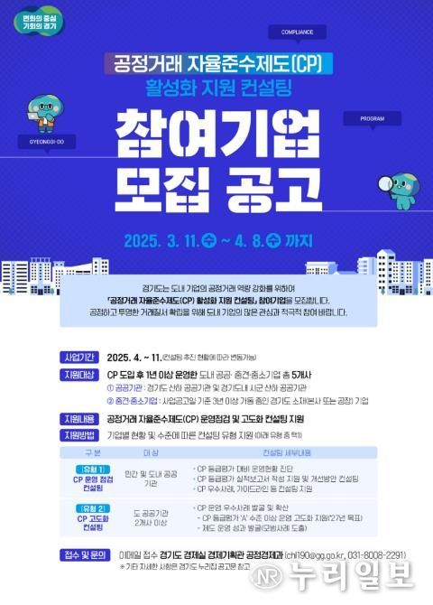(누리일보) 경기도가 기업의 공정거래 자율준수 문화 확산과 경영 애로 해소 지원을 위해 ‘공정거래 자율준수제도(CP, Compliance Program) 활성화 지원 컨설팅’을 추진한다.