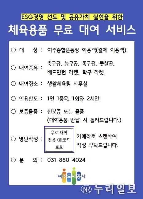 (누리일보) 여주도시공사는 여주종합운동장 이용 시민들의 편의를 높이기 위해, 2023년부터 시행해 온 ‘체육용품 무료대여 서비스’를 오는 2026년 4월 1일부터 대폭 확대 운영한다.