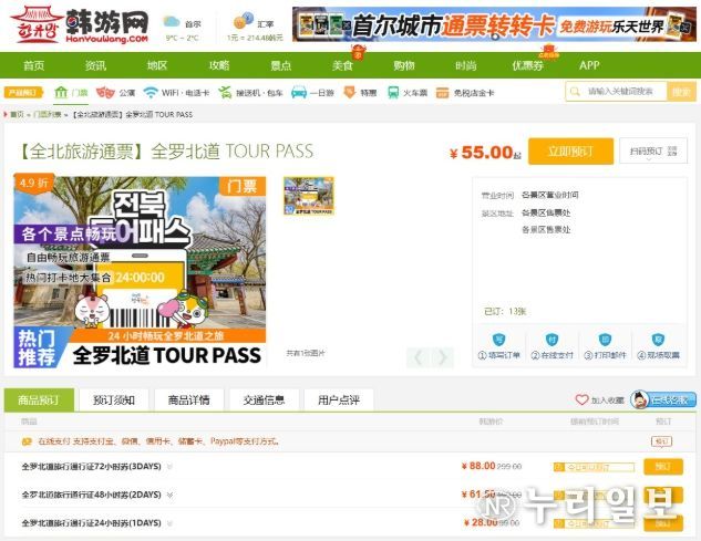 (누리일보) 전북특별자치도는 도내 대표 관광상품인 ‘전북투어패스’를 중국 최대 한국 여행 정보 플랫폼인 ‘한유망(韩游网)’에 입점시키고 이달부터 본격적인 판매에 돌입했다고 12일 밝혔다.