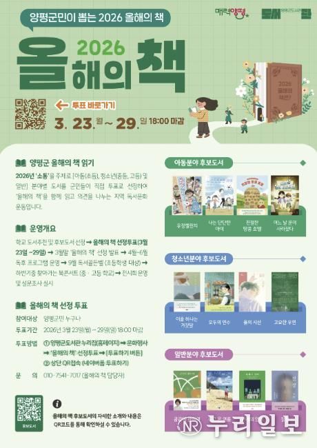 (누리일보) 양평군은 지역 주민과 함께 한 권의 책을 읽고 공감하는 독서문화 확산을 위해 2026년 ‘올해의 책’ 후보 도서를 선정하고 군민 투표를 실시한다고 밝혔다.