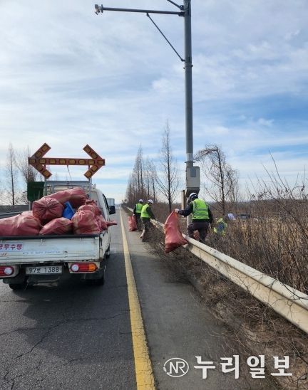 시는 지난 2월 26일 시작하여 3월 15일까지 관내 주요 국도 구간을 대상으로 환경 정비를 실시 중이며, 현재 교차로 및 비탈면 등에서 생활 쓰레기와 불법 투기 폐기물 등 1톤 마대 80여 개 분량의 폐기물을 수거하는 등 국도변 청소 작업을 하고 있다.