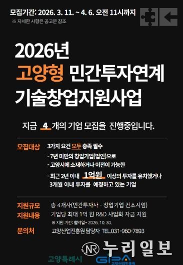(누리일보) 고양산업진흥원이 유망 기술창업기업의 투자 유치와 기술 고도화를 지원하기 위한 ‘2026년 고양형 민간투자연계 기술창업지원사업’에 참여할 창업기업을 모집한다.