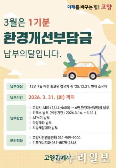 (누리일보) 고양특례시는 노후 경유 차량 소유자를 대상으로 2026년 상반기 정기분 환경개선부담금을 부과한다고 12일 밝혔다.