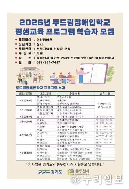 (누리일보) 동두천시가 장애인 평생교육 진흥을 위해 지원하고 있는 두드림장애인학교가 2026학년도 평생교육 프로그램 학습자를 모집한다.