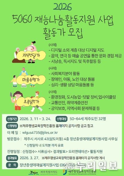 (누리일보) (재)제주평생교육장학진흥원(원장 진희종)에서는 제주도민 50~64세 대상으로 ‘5060재능나눔 활동가’를 모집한다.