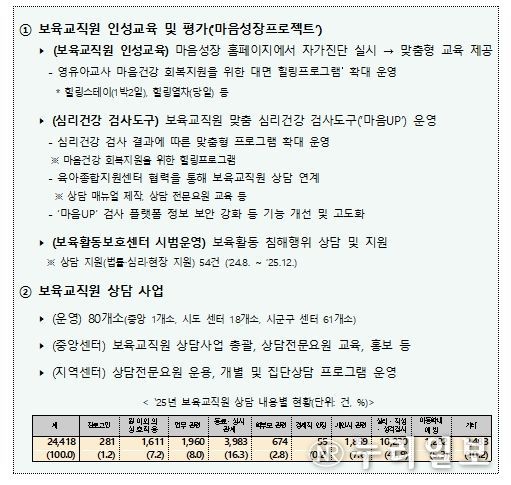 첫째, 중앙·지방 육아종합지원센터에 보육교직원의 보육활동을 보호·지원하는 전담조직을 둘 수 있도록 법적 근거를 마련했다. 이를 통해 보육교직원이 부당하게 보육활동 침해를 당하는 경우 전담조직을 통해 심리·법률지원 등 보호·지원을 받을 수 있도록 했다.