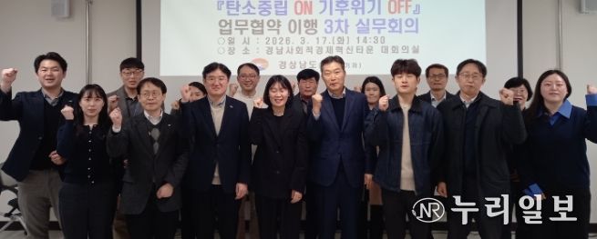(누리일보) 경상남도는 17일 오후 2시 경남사회적경제혁신타운 대회의실에서 한국농어촌공사, 한국산업단지공단, 한국남동발전 등 협약기관 실무자들이 참석한 가운데 ‘탄소중립 ON 기후위기 OFF’ 업무협약 이행을 위한 3차 실무회의를 개최했다고 밝혔다.