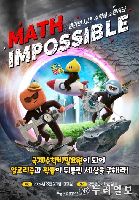 (누리일보) 과학기술정보통신부 국립중앙과학관은 3월 21일부터 22일까지 양일간, 관람객이 주인공이 되어 수학적 사고로 위기를 극복하는 임무형(미션형) 수학 행사 ‘Math Impossible: 혼란의 시대, 수학을 소환하라!’를 개최한다.