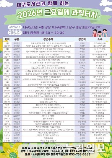 (누리일보) 대구도서관은 시민들에게 최신 과학기술과 연구 성과를 쉽고 흥미롭게 전달하기 위해 ‘2026년 금요일에 과학터치’ 프로그램을 본격 운영한다.