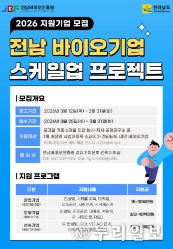 (누리일보) 전라남도가 2026년 신규사업으로 ‘전남 바이오기업 스케일업 프로젝트’를 본격 가동하고, 참여기업 모집에 나섰다.