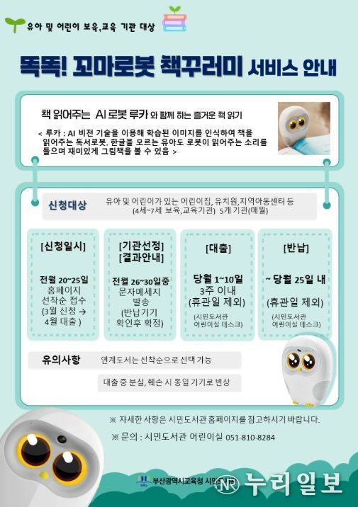 (누리일보) 부산시교육청 시민도서관은 어린이집, 유치원, 지역아동센터 등 4~7세 유아 및 어린이가 있는 기관을 대상으로 ‘똑똑! 꼬마로봇 책꾸러미’ 서비스를 운영한다고 19일 밝혔다.