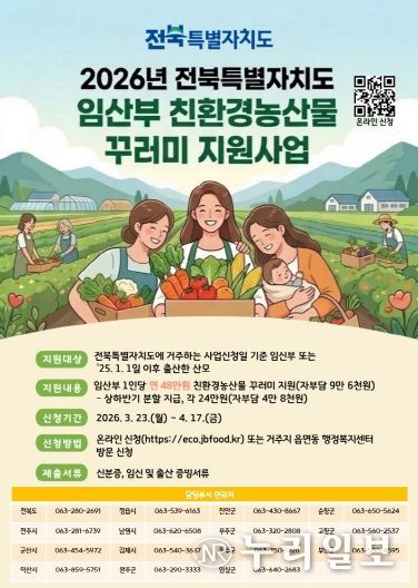 (누리일보) 전북특별자치도가 임산부의 건강 증진과 친환경 농산물 소비 확대를 위해‘임산부 친환경농산물 꾸러미 지원사업’신청을 오는 3월 23일부터 4월 17일까지 모집한다고 19일 밝혔다.