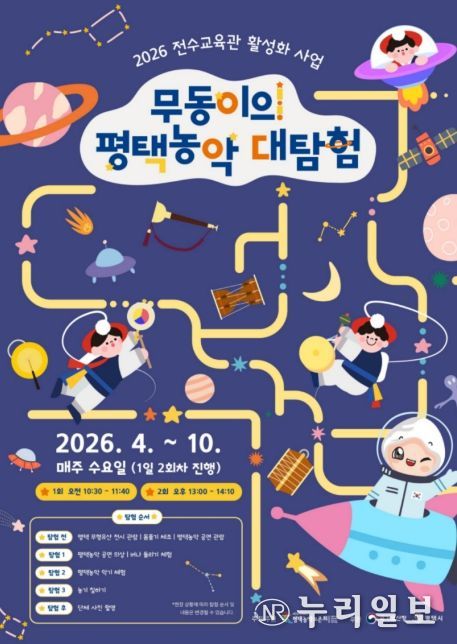 (누리일보) 평택시는 오는 4월 29일부터 10월 28일까지 2026년 전수교육관 활성화 지원사업 ‘무동이의 평택농악 대탐험’을 평택무형유산 전수교육관에서 매주 수요일, 1일 2회차 총 38회를 운영한다고 밝혔다.