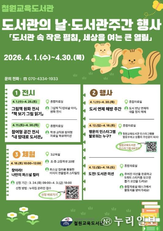 (누리일보) 철원교육도서관은 4월 12일 도서관의 날과 4월 12일부터 18일까지의 도서관 주간을 맞아 도서관 이용자와 지역 주민들을 대상으로 도서관의 날·도서관 주간 행사를 운영한다.