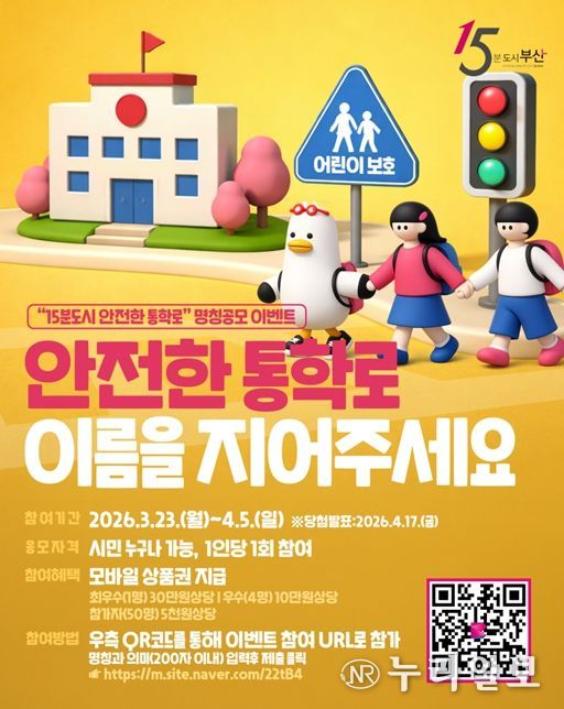 (누리일보) 부산시는 오늘(23일)부터 4월 5일까지 '15분도시 안전통학로 이름을 지어주세요'를 주제로 안전통학로 명칭 시민공모전을 개최한다고 밝혔다.