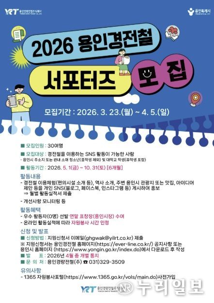 (누리일보) 용인특례시는 4월 5일까지 용인의 대표적인 철도인 용인경전철을 활성화하고자 ‘용인경전철 서포터즈’를 모집한다고 23일 밝혔다.