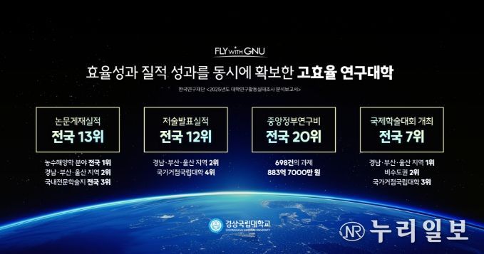 (누리일보) 경상국립대학교가 한국연구재단이 발간한 〈2025 대학연구활동실태조사 분석보고서〉에서 논문 실적과 연구 성과 전반에 걸쳐 전국 상위권을 기록하며 연구중심 국립대학으로서 위상을 강하게 입증했다.