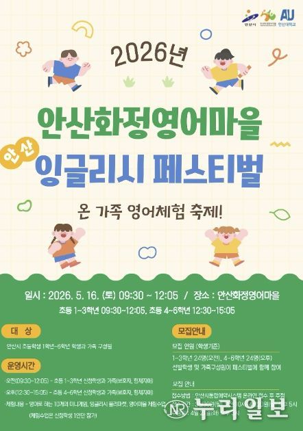 (누리일보) 안산시가 설립하고 안산대학교가 운영하는 안산화정영어마을은 ‘온 가족 영어체험 축제!’를 주제로 ‘안산 잉글리시 페스티벌’을 운영한다고 24일 밝혔다.