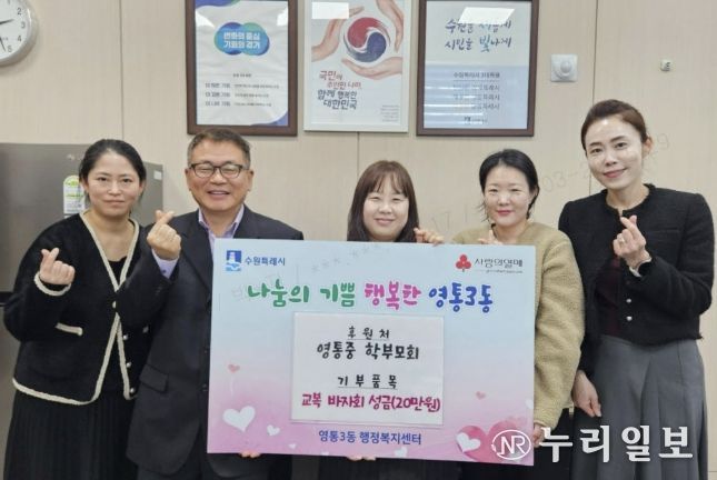 김인태 영통3동장은 “지역사회를 위해 따뜻한 나눔을 실천해주신 영통중 학부모회에 깊이 감사드리며, 전달받은 성금은 도움이 필요한 이웃에게 소중히 전달하겠다”고 감사의 뜻을 밝혔다.